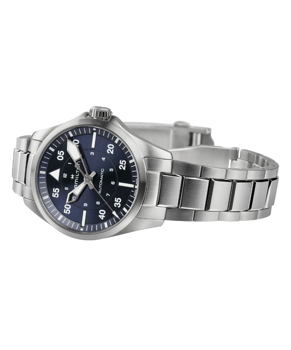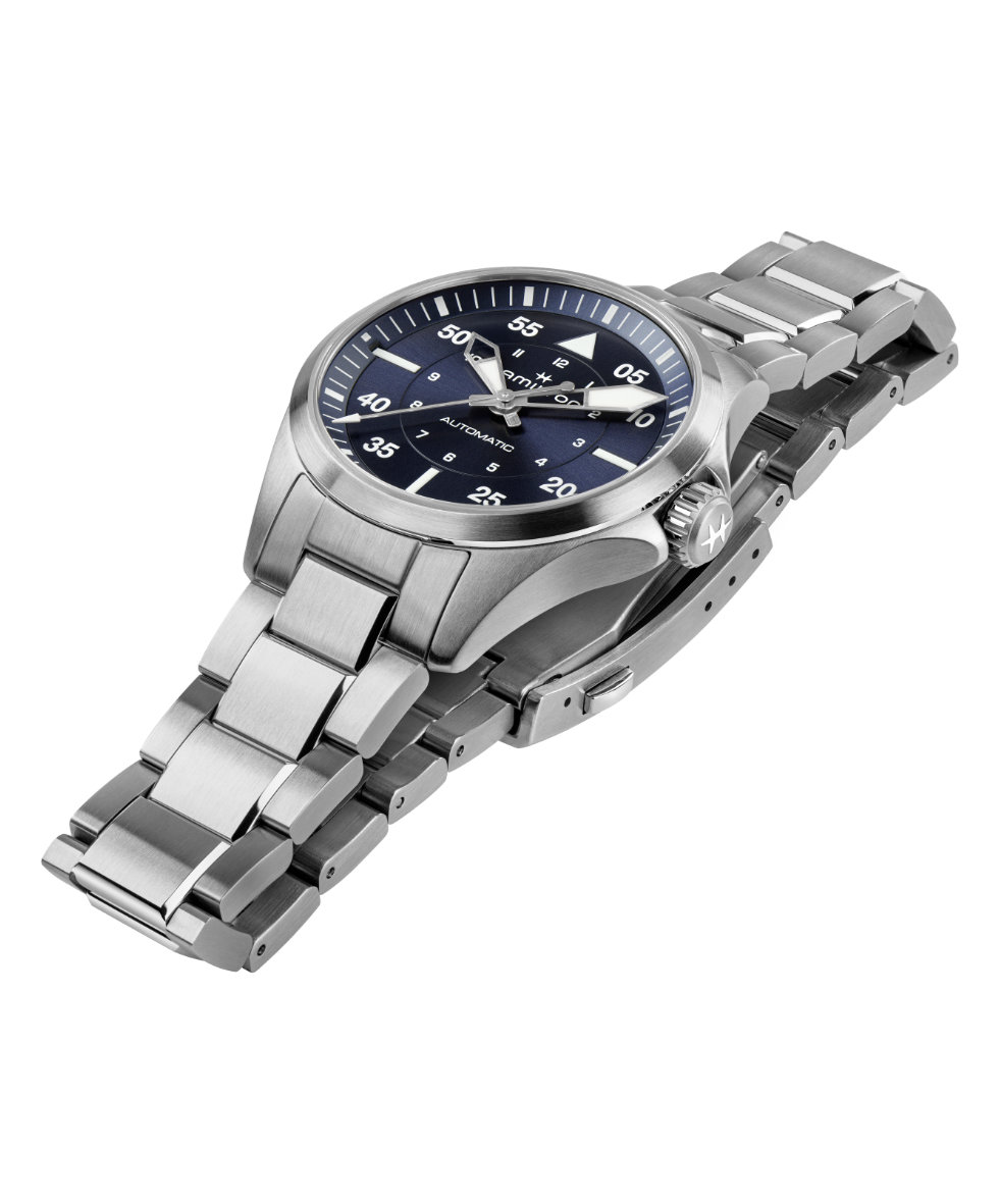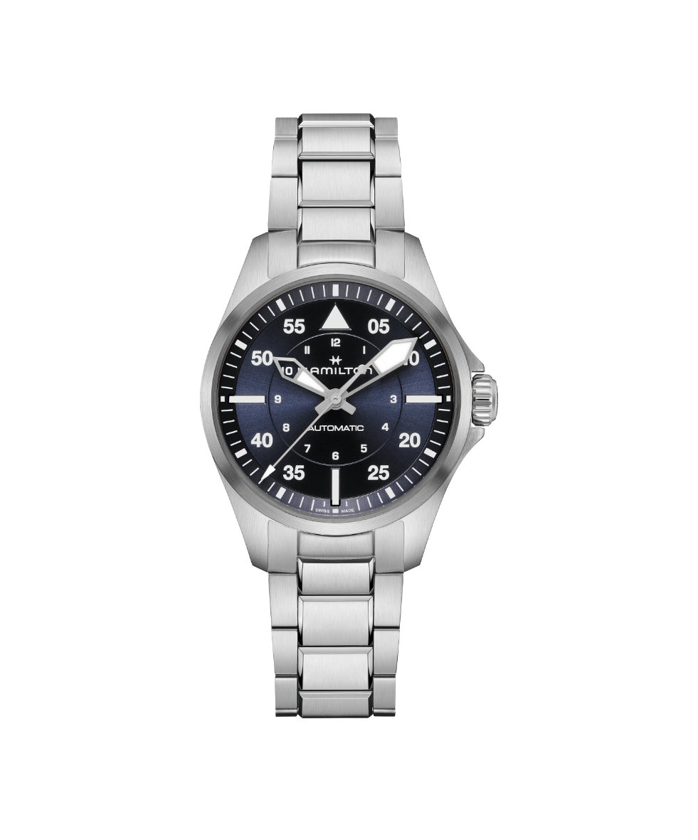 L'orologio Hamilton Khaki Aviation Pilot Auto 36mm si distingue per la sua cassa in Acciaio, finitura alternata dal diametro di 36 mm. Il design è incentrato sul quadrante Blu, protetto da un resistente vetro in Zaffiro che assicura massima chiarezza.