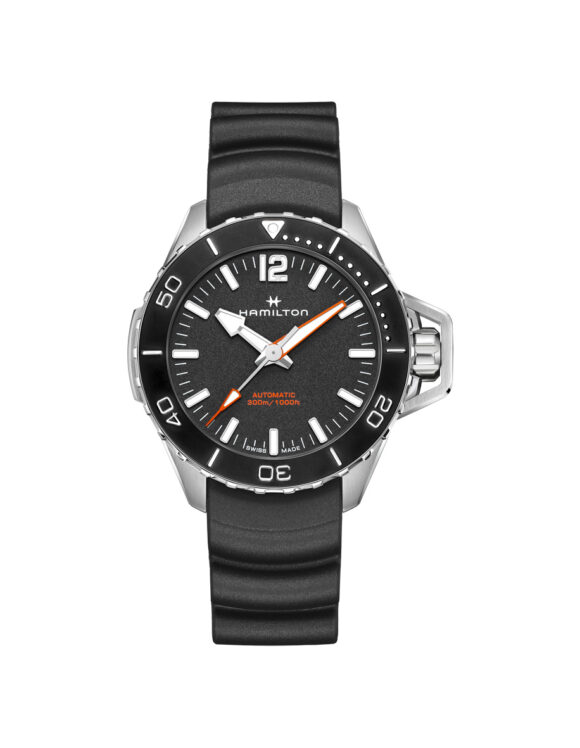 L'orologio Hamilton Khaki Navy Frogman Auto 41mm si distingue per la sua cassa in Acciaio, finitura satinata dal diametro di 41 mm. Il design è incentrato sul quadrante Nero, protetto da un resistente vetro in Zaffiro che assicura massima chiarezza.