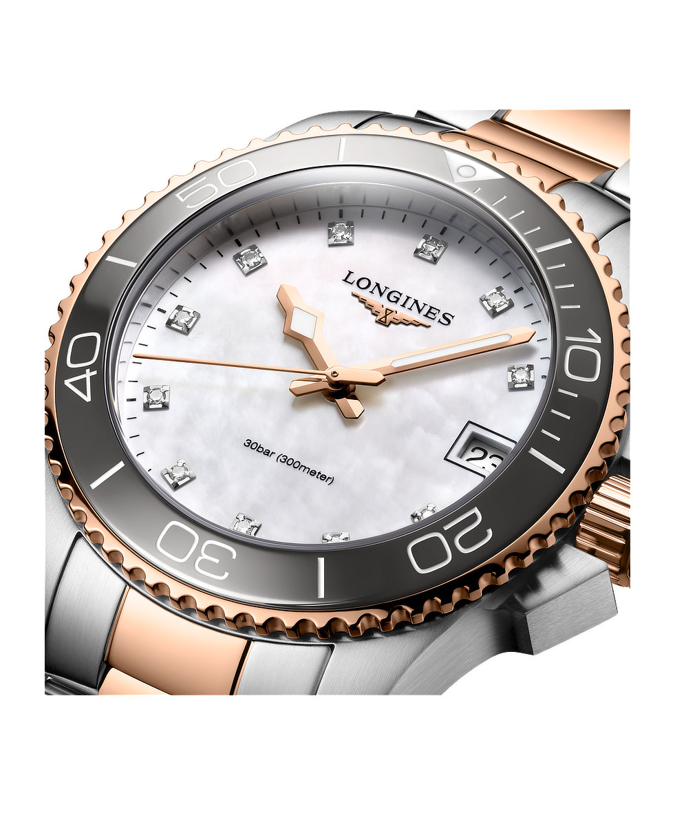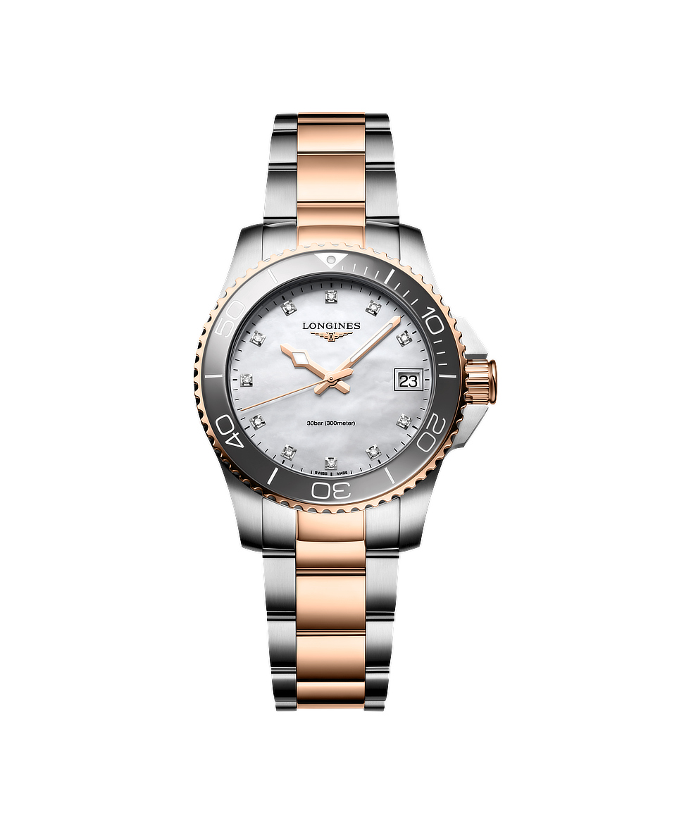 Longines Hydroconquest 32mm Madreperla e Diamanti Lunetta Ceramica Acciaio Bicolore Rosa Quarzo