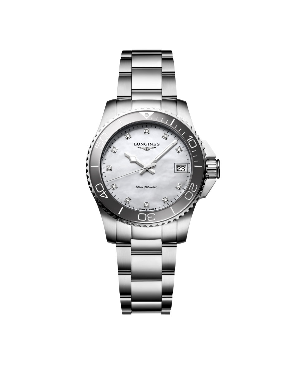 L'orologio Longines Hydroconquest 32mm Madreperla e Diamanti Acciaio si distingue per la sua cassa in Acciaio dal diametro di 32 mm. Il design è incentrato sul quadrante Madreperla, protetto da un resistente vetro in Zaffiro che assicura massima chiarezza.