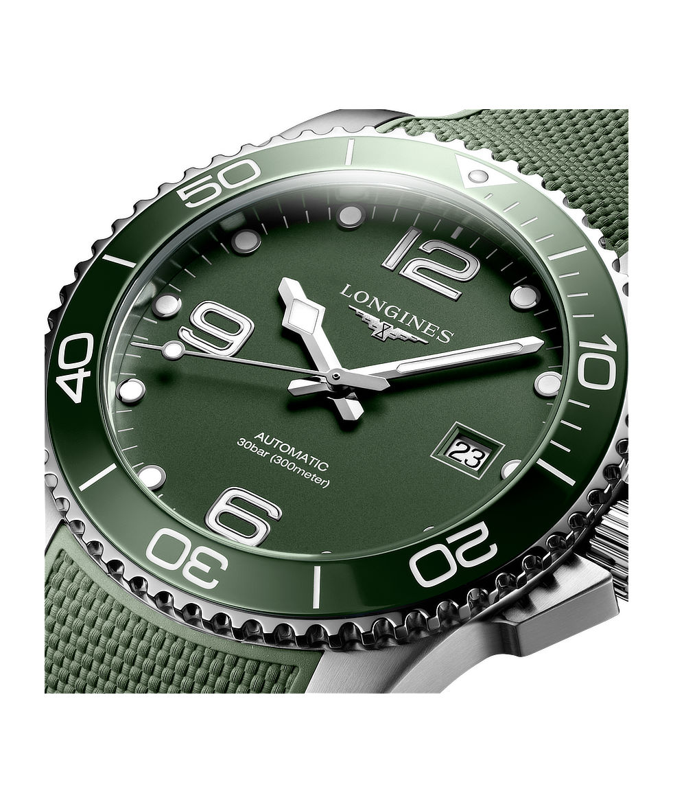 L'orologio Longines Hydroconquest 41mm Verde Gomma si distingue per la sua cassa in Acciaio dal diametro di 41 mm. Il design è incentrato sul quadrante Verde, protetto da un resistente vetro in Zaffiro che assicura massima chiarezza.
