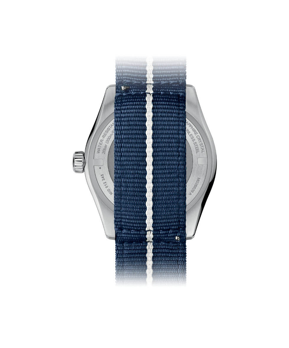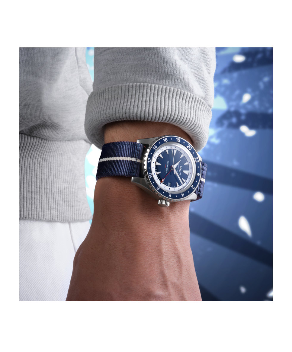 Questa edizione speciale viene fornita con bracciale in acciaio a maglia piena e cinturino in tessuto tecnico blu intercambiabili, per adattarsi facilmente a ogni stile e contesto. Una combinazione di design curato, tecnologia svizzera e vocazione da viaggio.