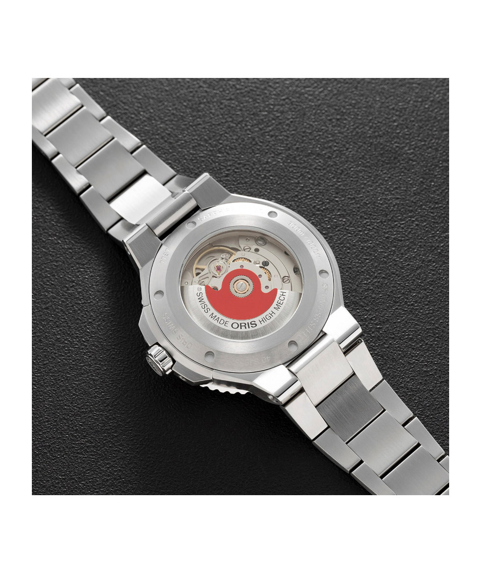 Al cuore dell’orologio Oris Aquis Date batte il movimento automatico Oris 733, che assicura precisione e prestazioni costanti nel tempo. Questo meccanismo offre una riserva di carica di 38 ore, con una frequenza stabile per l’intera giornata. Il fondello trasparente in vetro zaffiro consente di osservare l’elegante costruzione del movimento, espressione di competenza e tradizione orologiera.