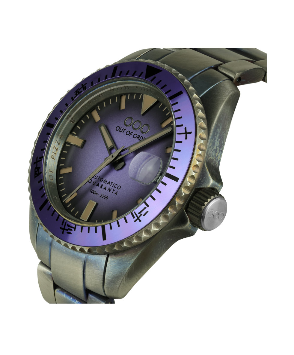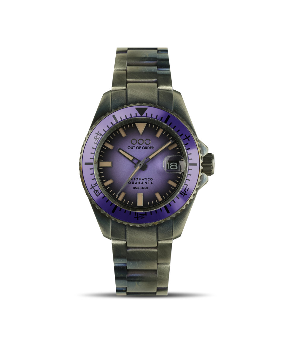 Orologio con cassa in acciaio, invecchiato del diametro di 40 mm, quadrante di colore viola e lunetta in acciaio, girevole unidirezionale.
