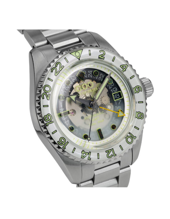 L’orologio, con movimento quarzo è dotato di funzione chrono e solo tempo e ha una resistenza all’acqua di 20 bar / 200 mt.
